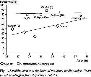 Forskellen i sensitivitet ved en fikseret cut-off- grænse og en gestationsalderafhængig cut-off- grænse ses i Fig. 1 . Resultaterne er fra arbejderne i Tabel 1. Her findes, at en gestationsalderafhængig cut-off -grænse giver den højeste sensitivitet hos unge kvinder. Hvis man vil benytte nakkefoldsscanning som screeningstest for kvinder under 35 år, vil den gestationsalderafhængige cut-off -metode således være den mest ideelle. Alle større centre internationalt er gået bort fra en fikseret cut-off- grænse.