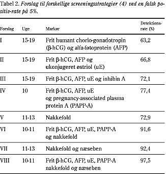 Der findes for øjeblikket flere metoder til screening for Downs syndrom og misdannelser. Ved en falsk positiv-rate på 5% giver en screening alene på baggrund af kvindens alder en sensitivitet på 30% for at finde fostre med Downs syndrom. Sensitiviteten stiger til 60-70% ved en kombination af moderens alder og en andentrimester-tripeltest. Ved en kombination af maternel alder og nakkefoldsscanning, som foregår mellem en gestationsalder på 11 uger og 13 uger og seks dage, er der en sensitivitet på 75% for at finde fostre med Downs syndrom. Man kan også foretage en integreret test med måling af nakkefold og pregnancy-associated plasma protein A (PAPP-A) i første trimester samt måling af frit humant chorio-gonadotropin (β-HCG), alfa-føtoprotein (AFP), ukonjugeret østriol (uE) og inhibin A i andet trimester (2). Ved denne kombination af undersøgelser fås en sensitivitet på 94% ved en falsk positiv-rate på 5%.