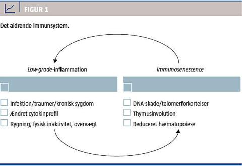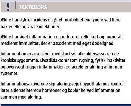 Aldring er associeret med reduceret funktion af det adaptive immunsystem og en proinflammatorisk fænotype (Figur 1). Det senile immunsystem er ikke bare vigtigt for vores håndtering af infektioner. Inflammaging opfattes i stigende grad som en del af en »smitsom« aldringsproces, hvor proinflammatoriske signaler fra celler i et organ kan inducere aldersassocierede forandringer og patologiske processer i andre væv som ved en dominoeffekt.