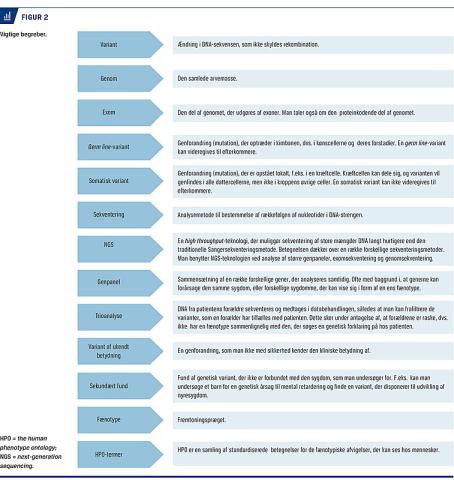 Ved exomsekventering anvendes next-generation sequencing (NGS) (Figur 2) til sekventering af den proteinkodende del af genomet (1-2% af det humane genom). Der identificeres omkring 50.000 varianter hos et individ. Hovedparten af disse er hyppige normaltforekommende varianter, der umiddelbart kan frasorteres. Kandidatvarianter indkredses yderligere ved at bruge sekvensdata fra relevante familiemedlemmer til filtrering. Efterfølgende prioritering af varianter bygger på varianternes forventede effekt på proteinniveau samt en gennemgang af litteratur og databaser.