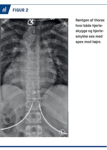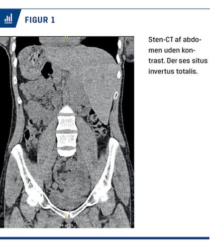 Urinstiks var positiv for blod. På mistanke om sten i urinvejene foretog vi en CT af abdomen uden kontrast. Ved denne påvistes kun et lille konkrement i venstre pelvis, antageligt var det symptomgivende konkrement afgået. Som bifund så vi intratorakale og -abdominale organer med spejlvendt placering, altså SI totalis (Figur 1).