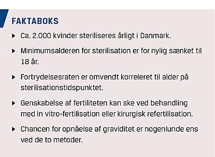 Regret of sterilization is inversely correlated to age at the time of sterilization. The minimum age for legal sterilization in Denmark has recently been lowered to 18 years. In Denmark surgical refertilization has almost completely been replaced by in vitro fertilization (IVF). In recent literature pregnancy results after surgical refertilization are easily comparable to IVF. Refertilization may in some cases be advantageous to IVF treatment. Women requesting reversal of sterilization should be offered individualized evaluation and differentiated treatment. It is recommended that surgical refertilization is performed at very few centres.