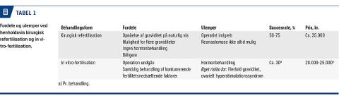Resultaterne med hensyn til fødsel af levende barn efter behandling med henholdsvis kirurgisk refertilisation og IVF-behandling synes imidlertid i en række udenlandske opgørelser at være nogenlunde ens. Der er en række forskellige fordele og ulemper ved de to behandlingsformer (Tabel 1). Med det forventelige øgede behov for behandling af kvinder, der har fortrudt, at de har ladet sig sterilisere, forekommer det relevant at gennemgå området.