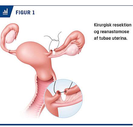 Graviditetsraten efter kirurgisk refertilisation med resektion og reanastomose af tuba uterina (Figur 1) var i en ældre dansk opgørelse (1979-1983) på 44% ved refertilisation efter tidligere laparoskopisk sterilisation og 19% ved refertilisation efter tubaresektion ved laparotomi [11]. Der foreligger mere end 40 nyere, udenlandske opgørelser, hvor graviditetsraterne efter kirurgisk refertilisation var betydeligt højere (51-91%), typisk opnåede 60-70% af de opererede kvinder graviditet [11-24]. Graviditetsraten synes først og fremmest at afhænge af kvindens alder på operationstidspunktet, dernæst af observationsvarigheden og af den teknik, der er anvendt ved refertilisationen, herunder varierende grader af mikrokirurgi. En stigende andel af refertilisationerne er foretaget laparoskopisk, hvor der synes at være opnået nogenlunde samme resultater som efter laparotomi og mikrokirurgisk teknik. Indgrebet beskrives oftest som relativt simpelt, kortvarigt og komplikationsfrit, kræver kun kort indlæggelse og kan ofte foretages i sammedagskirurgisk regi [13]. Robotassisteret laparoskopisk operation kan muligvis forbedre resultaterne yderligere [14]. Risikoen for efterfølgende