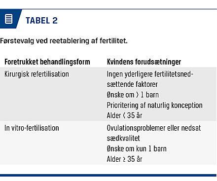 En steriliseret kvinde, der ønsker at blive gravid, bør vurderes og vejledes individuelt, og der bør være mulighed for et differentieret tilbud. Hvis kvinden er ung (< 35 år), ønsker sig mere end ét barn, og der ikke er nogen fertilitetsnedsættende faktorer – herunder nedsat sædkvalitet – i øvrigt, og prioriterer hun at kunne opnå graviditet »på normal vis«, bør hun kunne tilbydes kirurgisk refertilisation (Tabel 2). Viser denne sig ikke at kunne gennemføres, eller er der ikke opnået graviditet 1-2 år efter operationen, kan man så foretage IVF-behandling.