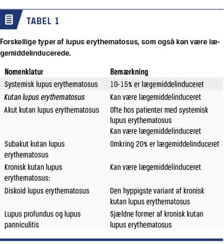 Lupus erythematosus (LE) er betegnelsen for en række sygdomme, der kendetegnes ved autoimmunitet over for bl.a. DNA. LE kan udløses af lægemidler og betegnes så lægemiddelinduceret LE (DILE) [1, 2]. DILE defineres som et lupuslignende syndrom, der har relation til brug af et specifikt lægemiddel. Der findes ingen diagnostiske kriterier for DILE, men tilstanden er kendetegnet ved, at symptomerne remitterer ved seponering af det pågældende lægemiddel [1, 3]. DILE kan klinisk og serologisk ligne idiopatisk lupus, enten i form af systemisk lupus erythematosus (DI-SLE) eller kutan lupus erythematosus (DI-CLE), hvor der ved sidstnævnte som oftest er symptomer, der ligner subakut CLE (DI-SCLE) [3, 4] (Figur 1). I Tabel 1 vises en skematisk oversigt over den anvendte LE-terminologi.