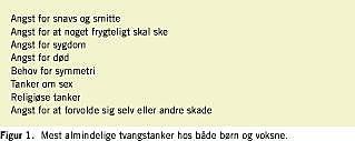 Ifølge såvel International Classification of Diseases (ICD)-10 som Diagnostic and Statistical Manual of mental disorders (DSM)-IV defineres OCD ved tilstedeværelsen af enten obsessioner eller kompulsioner [2]. Obsessioner er tilbagevendende, invaderende ideer, tanker, billeder eller impulser, som er jegfremmede, og som af barnet eller den unge bliver opfattet som meningsløse eller modbydelige. Kompulsioner er gentagne handlinger, som udføres efter et bestemt mønster eller på en stereotyp måde. Handlingen er i sig selv ikke meningsfuld, men tjener til at afværge katastrofetænkning og angst. For at opfylde diagnoserne må obsessionerne og kompulsionerne være en kilde til belastning og interferere med barnets sociale funktion. Selv om diagnosekriterierne således lægger op til, at patienten selv anser symptomerne for at være overdrevne og indimellem bizarre og derved rationelt læg- ger afstand til dem, har børn oftest en ringere indsigt i deres symptomer og er ofte præget af mindre modstand mod symptomerne end voksne. Det kliniske billede er stort set ens på de forskellige aldersgrupper og på tværs af forskellige kul- turer.
