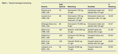 Generelt er effekten af medicin moderat, hvilket kan ses af Tabel 1 . Der er kun i sjældne tilfælde tale om, at symptomerne forsvinder, oftest reduceres de med 25-50%. Det er således vigtigt, at den medikamentelle behandling ikke står alene, men at den følges op med effektiv kognitiv adfærdsterapi, hvor dette er muligt (Tabel 1).