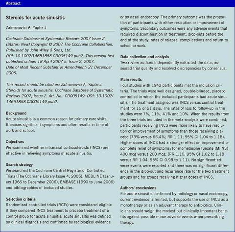 - Zalmanovici A, Yaphe J. Steroids for acute sinusitis. Cochrane Database of systematic reviews 2007, Issue 2. Art.No.:CD005149. DOI:10.1002/ 14651858.CD005149.pub2.