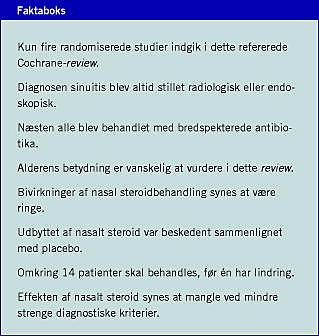 Min konklusion efter at have læst dette Cochrane-review er, at jeg nok noget hyppigere end tidligere vil overveje at behandle patienter med akut sinuitis med nasalt steroid. Dette vil særligt gælde patienter, hvor der ikke er tvivl om diagnosen, og patienter, der allerede har brugt detumeserende næsedråber/ spray i en uges tid uden særlig effekt, og hvor næseslimhinden er ved at være godt irriteret. Vi må afvente yderligere veltilrettelagte randomiserede undersøgelser, før en endelig vur-dering af intranasal steroidbehandling til patienter med akut sinuitis er mulig.