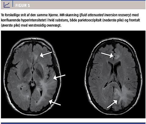 MR-skanning af cerebrum (Figur 1) samme dag. Skanningen viste store multifokale læsioner i den hvide substans, periventrikulært og subkortikalt, overvejende i venstre side, og patienten blev indlagt til plasmaferesebehandling. Ved en spinalvæskeundersøgelse bekræftedes tilstedeværelsen af JC-virus.