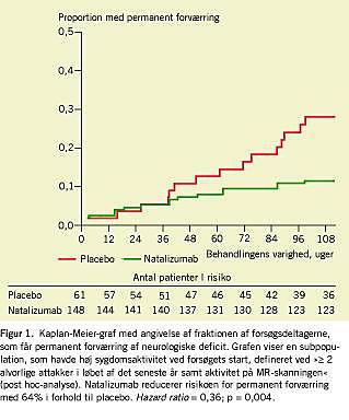 Nzb reducerede attakhyppigheden med 68% i forhold til placebo, og denne relative forskel bestod efter to år. Andelen af patienter, hvis permanente neurologiske deficit forværredes i løbet af hele studieperioden, var reduceret med 42% i Nzb-gruppen i forhold til i placebogruppen. Ved stratificering efter sygdomsaktivitet ved forsøgsstart var der i patientgruppen med høj sygdomsaktivitet endnu større gevinst (Figur 1 ). Denne overbevisende kliniske effekt blev understøttet af data fra magnetisk resonans (MR)-skanning, som bl.a. viste en reduktion på 83% i tilkomst af nye eller forstørrede læsioner.