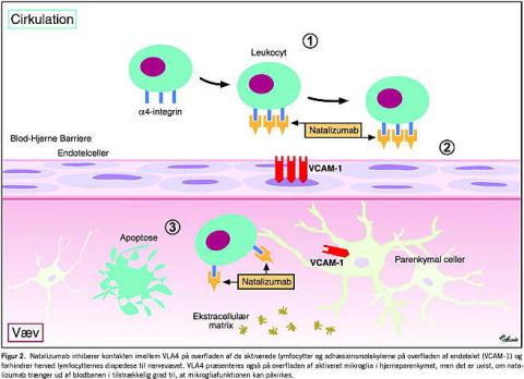Natalizumab (Nzb) er et rekombinant monoklonalt antistof mod α4 -intigrin. De hypervariable regioner af immunglobulin G (IgG)-molekylet stammer fra mus, mens resten er humant. α4 -intigrin er en del af det adhæsionsmolekyle, som præsenteres på overfladen af aktiverede lymfocytter. Interaktion med dets ligand, VCAM-1, som findes på endotelet, er et af de tidlige trin i lymfocyttens diapedese til det omgivende væv. Nzb blokerer interaktionen mellem α4 -intigrin og VCAM-1 og dermed udvikling af den perivaskulære inflammatoriske proces, som er karakteristisk for multipel sklerose (MS).