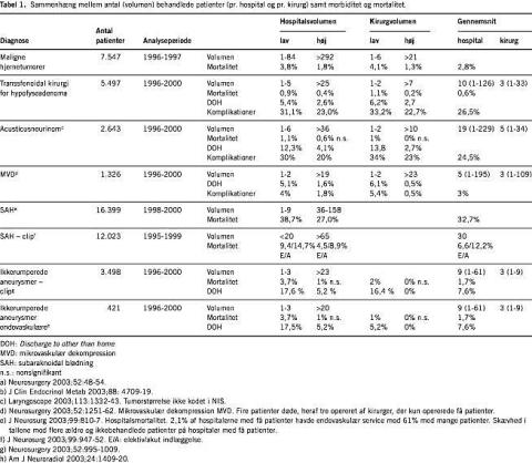 I 2003 er der i Journal of Neurosurgery og i Neurosurgery fremkommet en række artikler om sammenhængen mellem patientvolumen og outcome . Tabel 1 viser nogle data fra disse analyser for en række sygdomme og deres behandling. Analyserne viser ikke overraskende en aftagende morbiditet og mortalitet med stigende patientvolumen for både hospitaler og kirurger; jo mere erfaring, des bedre resultater generelt. Den samme sammenhæng mellem volumen og outcome ses også ved andre kirurgiske behandlinger [2, 3], og på den baggrund er der i USA etableret en større sammenslutning af arbejdsgivere - The Leapfrog Group - som for deres forsikrede medarbejdere kræver behandling på hospitaler og af kirurger med et vist patientvolumen for fem højrisikooperationer (koronar bypass, aortaaneurysme, koronar angioplastik, øsofagektomi og carotis endarterektomi) [4].