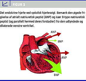 Hjertemuskulaturen producerer og frisætter natriuretiske peptider til blodbanen. Peptidhormonerne stimulerer den renale salt- og vandudskillelse, øger blodkarrenes permeabilitet og virker samtidigt antagonistiske til en række vasokonstriktorer [1]. Hos raske individer syntetiseres atrialt natriuretisk peptid (ANP) og det strukturelt beslægtede B-type natriuretisk peptid (BNP) helt overvejende i atrierne. Ved hjertesygdom i ventriklerne opreguleres den ventrikulære ekspression af BNP-genet dog kraftigt, hvilket har medvirket til, at måling af især BNP i plasma har vundet størst indpas i klinisk praksis. Ved hjerteinsufficiens frigives der således store mængder BNP fra ventriklerne [2] (Figur 1 ). Det udløsende stimulus er stræk i kardiomyocytterne som følge af øget transmuralt tryk, kammerdilatation og væghypertrofi [3]. Under den normale biosyntese fraspaltes der desuden et N-terminalt fragment (NT-proBNP) fra propeptidet, som secerneres parallelt med BNP til blodbanen [4]. Halveringstiden for NT-proBNP i blodbanen anslås til at være længere end for BNP (henholdsvis ca. 120 og 20 minutter), hvorfor koncentrationen af NT-proBNP i plasma typisk er højere end BNP. Nye resultater har desuden vist, at BNP og NT-proBNP ikke er de eneste molekylære former i plasma, og at et ikkespaltet prohormon i stigende grad frigives ved svært hjertesvigt [5].
