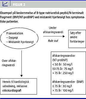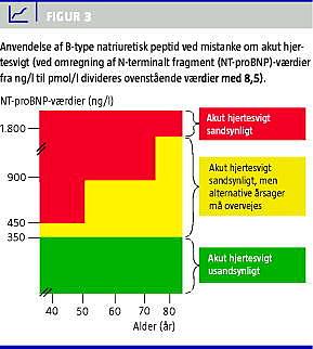 Anvendelse af grænseværdier på 400 ng/l for NT-proBNP og 100 ng/l for BNP, som anbefalet i nylige kliniske retningslinjer fra en arbejdsgruppe under ESC [19], vil give uacceptabelt lave negative prædiktive værdier for yngre personer og føre til, at mange patienter med hjertesvigt overses. Disse grænseværdier kan derfor kun anbefales hos personer over 75 år.