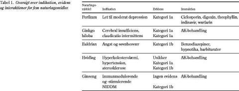 I årtusinder har mennesker anvendt lægeurter og -planter, og flere traditionelle lægemidler er udviklet fra planter (Fig. 1 ). Sædvanligvis har naturlægemidler lettere og færre uønskede virkninger end traditionelle lægemidler. Lægemiddelstyrelsens Bivirkningsnævn modtager årligt indberetning om ca. seks tilfælde af bivirkninger fra naturlægemidler. Den generelle indberetningsfrekvens er under en procent, fordi læger føler mindre tilskyndelse til indberetning, når behandlingen er iværksat af andre (personlig meddelelse). Artiklen søger at øge opmærksomheden omkring fem hyppigt anvendte naturlægemidler, som beskrives mhp. evidens og lægemiddelinteraktioner i klinisk praksis.