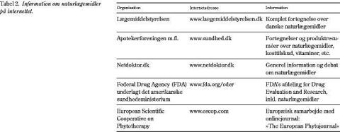 Det er vigtigt, at der i sygdomsdiagnostik og -behandling indgår overvejelser om naturlægemidlers rolle i sammenhængen. En åben og fordomsfri holdning til patientens brug af naturlægemidler er nødvendig for at opnå værdifuld information om interaktioner og bivirkninger. Patienter er mere villige til at oplyse om interaktioner og bivirkninger ved traditionelle lægemidler end ved naturlægemidler, hvorfor læger specifikt bør spørge til indtagelse af naturlægemidler (38). Således kunne patientjournalens anamneseafsnit og anæstesiskemaet suppleres med rubrikken »Naturlægemidler« på linje med »Medicin«. Almen information om naturlægemidler kan findes på internettet (Tabel 2 ).