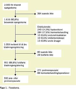 Materiale og metoder: En tilfældig stikprøve på 2.000 45-54-årige kvinder i Danmark fik tilsendt et spørgeskema, som 1.616 kvinder besvarede. Af disse kunne 1.059 kvinder med naturlige gynækologiske forhold indgå i et prospektivt studie, hvor kvinderne daglig registrerede deres blødningsforhold gennem et år. I alt 951 (89,8%) kvinder gennemførte et års blødningsregistrering, af disse var 592 kvinder præ- eller perimenopausale.