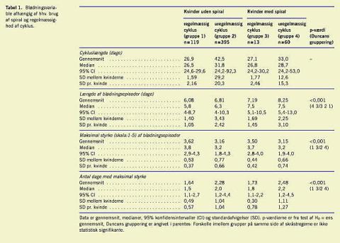 Var iansanalyser blev brugt til at beskrive fire grupper af kvinder (regelmæssig/uregelmæssig cyklus med/uden IUD) i forhold til blødningsvariablerne: cykluslængde, blødningslængde og blødningsstyrke.