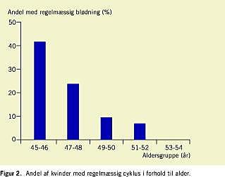 Det er veldokumenteret, at uregelmæssig cyklus, som kendetegner perimenopausen, begynder flere år før menopausen [2-4]. Imidlertid er der i litteraturen ikke nogen anerkendt definition af regelmæssig/uregelmæssig cyklus, og dette kan, sammen med forskelle i undersøgelsernes design, formentlig forklare forskellen på medianalderen for starten på perimenopausen. Vore resultater (Figur 2), som er baseret på stringente, objektive kriterier for regelmæssig cyklus, er imidlertid i overensstemmelse med Treloars resultater [2], at 50% af kvinderne var påbegyndt perimenopausen i en alder af 45,5 år, 75% ved 47,8 år og 95% ved 50,8 år.