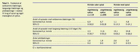 Hyppigheden af voldsom blødning, langvarig blødning og pletblødning hos de fire grupper af kvinder fremgår af Tabel 3 .