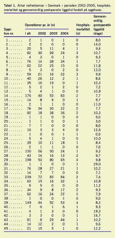 Ovenstående gennemgang af de 1.968 pa tienter, der fik foretaget nefrektomi i perioden 2002-2005 i Danmark, viser, at operationerne (gennemsnitlig 650 pr. år) blev udført på 45 afdelinger i 2002 faldende til 29 afdelinger i 2004.