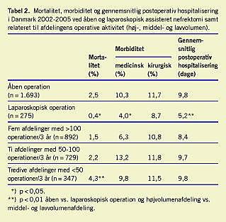 Den samlede mortalitet var på 2,2%. På de fem afdelinger, hvor man udførte mere end 100 operationer i løbet af tre år, var hospitaliseringen kortest og den postoperative mortalitet lavest (Tabel 2 ).
