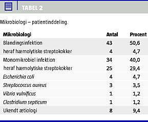 De mikrobiologiske dyrkninger viste, at 43 patienter havde blandingsinfektioner (51%), hvorimod der hos 34 patienter kun kunne påvises en enkelt mikroorganisme (40%) - i de fleste tilfælde hæmolytiske streptokokker. Hos otte (9%) patienter var det ikke muligt at identificere en udløsende mikroorganisme (Tabel 2 ).