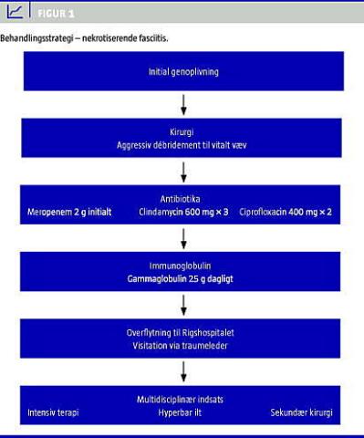 Summary Necrotizing Fasciitis Ugeskr Læger 2010;172(6):440-444 Introduction: Necrotizing fasciitis (NF) is an acute soft-tissue infection, associated with a high mortality and morbidity. To reduce the mortality, an early diagnosis and treatment is essential. Our study aims to identify the number of patients, the microorganisms involved, and NF treatment outcomes among patients admitted to our unit. Material and Methods: This retrospective cohort study enrolled 85 patients admitted to the multidisciplinary, tertiary Intensive Care Unit, Abdominal Center, Rigshospitalet, Denmark in 2005-2007. All received the same protocolled treatment of intensive care, extensive surgical débridements, broad-spectrum antibiotics, intravenous immunoglobulin and hyperbaric oxygen. Results: The microbiological analyses of specimens demonstrated that 51% were positive for polymicrobial infection, 40% for a single pathogen, 74% of these caused by β-hemolytic streptococci, and 9% of the analyses were inconclusive. Of the patients, 91% required treatment in a respirator, 67,5% presented with septic shock and 25,3% developed acute renal failure needing dialysis. Intensive care unit mortality was 6% and 30-day mortality was 9,5%. Expected mortality based on SAPS II and APACHE II scoring was 38%. Our patients had a significantly higher body mass index than other patients admitted to the unit. Conclusion: NF is a complex disease, often associated with multi-organ failure. A protocolled treatment plan with close cooperation between the intensive care, clinical microbiology, medical and surgical specialties seems to reduce mortality considerably in this vulnerable group of patients.