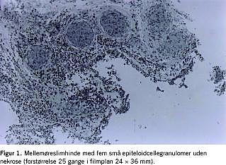 Ved operationerne, der blev udført af samme operatør, fandtes mellemøret opfyldt af ekstremt adhærent fortykket, flæsket, grårødlig granulerende slimhinde med andre karakteristika end ved uspecifik inflammation. I de to tilfælde, hvor der også blev foretaget mastoidektomi, blev der fundet samme forhold her. I biopsierne fra de to første operationer var overfladen dækket af pladeepitel og respirationsvejsepitel, det underliggende bindevæv var betændelsesinfiltreret og indeholdt adskillige små, helt runde epitelcellegranulomer (Figur 1), nogle med en enkelt multinukleær kæmpecelle. Der var ingen nekroser eller syrefaste stave i granulomerne. Der blev fundet negativ Ziehl-Nielsen-farvning. Ved sidste operation blev der fundet ossøs destruktion i øregang og mastoid. En histologisk undersøgelse viste granulomatøs inflammation med nekrose i granulomerne og multinukleære kæmpeceller, nogle med randstillede kerner. Der var ingen vaskulitis. Ved revurdering af præparaterne kunne man udelukke Langerhanscelle-histiocytose. Dyrkning af væv fra mellemøret viste ikke vækst af mykobakterier. Der blev ikke fundet nogen Aspergillus, som det tidligere sås ved en podning. Væsketal, ioniseret calcium og infektionstal inkl. sænkningsreaktionen var normal. Perinukleær fluorescens antineutrofile cytoplasmatiske antistoffer (P-ANCA)-immunglobulin G (IgG), myeloperoxidase (MPO)-ANCA-IgG og diffus granulær fluorescens, klassisk (C)-ANCA-IgG/peoteinase 3 (PR3)-ANCA-IgG var negative. Immunoglobuliner inklusive subklasser var normale. Der blev fundet normale forhold ved øjenundersøgelser og røntgenundersøgelser af thorax gennem to år. Der var let forhøjet serum-angiotensinkonverterende enzym (S-ACE) (alderskorrigeret), og der blev fundet lavt funktionelt mananbindende lectin (MBL) ved undersøgelse for immundefektsygdomme. Genotypebestemmelse: YA/B forenelig med lavt funktionelt MBL. Et år efter den sidste operation var der tiltagende otalgi, som blev behandlet med prednisolon med god smertelindring til følge. Patienten havde derefter let bilateral konduktiv hørenedsættelse, der ikke var socialt hæmmende.