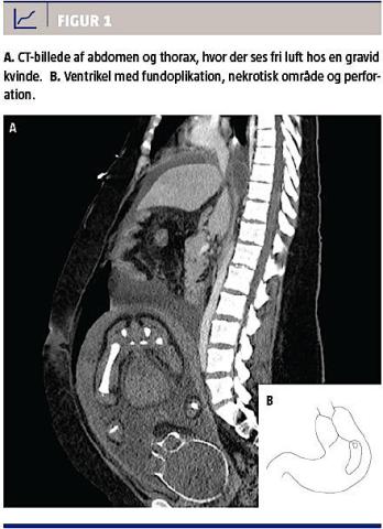En 31-årig overvægtig kvinde (body mass index 36 kg/m2), som var gravid i uge 34, blev indlagt med mavesmerter, kvalme og opkastninger. Hun var i 2009 blevet opereret med laparoskopisk fundoplikation for hiatushernie og refluks. I løbet af graviditeten havde hun fået hyppige refluksgener. Ved indlæggelsen blev hun primært behandlet på mistanke om ketoacidose. Hun havde haft diffuse mavesmerter i 3-4 dage. En arteriepunktur viste et pH på 7,25 og en glukosekoncentration på 13 mmol/l. En urinstiks viste maksimalt udslag for ketoner. Ved indlæggelsen blev der foretaget kardiotokografi (CTG), der viste normal føtal hjertelyd.