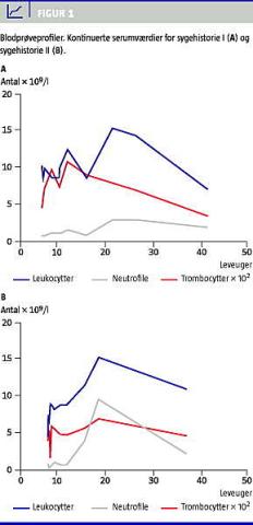 I. En en måned gammel dreng (første graviditet) blev indlagt med prolongeret icterus. Han havde siden fødslen virket utilpas og var blevet behandlet af kiropraktor, da der var mistanke om stramme halsmuskler. I blodprøverne fandtes overraskende lave neutrofile granulocytter samt trombocytose. Gentagne blodprøver viste neutropeni og tiltagende trombocytose (Figur 1 A). Desuden fandt man celleskygger i stort antal ved mikroskopi.