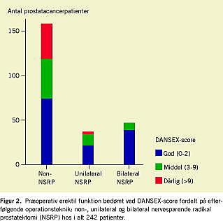 Materiale og metoder: I perioden 2003-2006 fik 242 patienter foretaget radikal prostatektomi. Af dem fik 84 tilbudt NSRP. Data vedrørende den præoperative og 12 måneder postoperative erektile funktion er sammenlignet, ligesom den potentielle risiko for nedsat postoperativ tumorkontrol ved NSRP er søgt belyst.