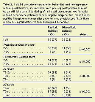 For at imødegå unødig kompromis af indgrebets radikalitet er tilbuddet om nervesparende operationsteknik forudgået af en risikovurdering af den enkelte patient. Som det fremgår af Tabel 1, indeholder den nervesparede patientgruppe signifikant færre patienttilfælde med PSA > 10 ng/ml, Gleason-score > 6 og palpabel tumorstadie (cT2). Postoperativt blev der ved præparatundersøgelsen konstateret 60 (25%) tilfælde med manglende radikalitet i form af positive kirurgiske margener. Blandt disse var seks (13%) og ni (24%) af patienterne behandlet med henholdsvis bilateral og unilateral NSRP, mens det tilsvarende antal ved ikke-NSRP var 45 (29%). Dette forhold er uden statistisk signifikant forskel (p = 0,2) (Tabel 1).