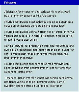Summary Vestibular neuritis Ugeskr Læger 2008;170(21):1809-1815 Vestibular neuritis is the second most common cause of peripheral vestibular vertigo. Its assumed cause is a reactivation of herpes simplex virus type 1 infection. Methylprednisolone significantly improves the recovery of peripheral vestibular function in patients with vestibular neuritis. Clinical studies suggest that specific vestibular exercises improve vestibulo-spinal and vestibulo-ocular compensation in patients with vestibular neuritis. This review discusses the above and comments ethiology, epidemiology, pathophysiology, diagnostic procedures and differential diagnosis.