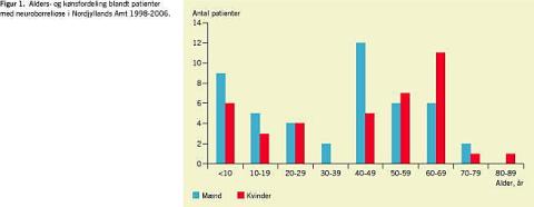 I Nordjyllands Amt fik mindst 84 patienter stillet diagnosen neuroborreliose i niårsperioden 1998-2006, hvilket svarer til en årlig incidens på 2/100.000 personer. Aldersmæssigt fordelte patienterne sig omkring en middelværdi på 40 år med en kønsfordeling på 46 mænd (12 børn) og 38 kvinder (ni børn). Der blev observeret relativt flest tilfælde hos børn samt hos de 40-70-årige (Figur 1 ). Forekomsten af neuroborreliose udviste stor variation i løbet af årets måneder med klart flest tilfælde om sommeren og efteråret (Figur 2 ).