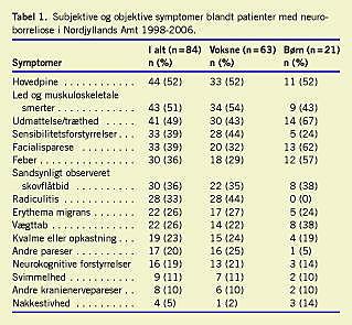 Symptombilledet hos børn og voksne adskilte sig, særligt hvad angik facialisparese (børn 62%; voksne 32%; oddsratio (OR) = 0,29 og p < 0,02), feber (børn 57%; voksne 29%; OR = 0,30 og p < 0,03), radiculitis (børn 0%; voksne 44%) og sensibilitetsforstyrrelser (børn 24%; voksne 44%, OR = 2,56 og p < 0,11). Hos otte ud af 84 patienter, heraf tre børn, var symptombilledet helt uden neurologiske udfald. De angivne symptomer bestod udelukkende af træthed/udmattelse, hovedpine, led og muskuloskeletale smerter samt feber. I tillæg til diagnosen neuroborreliose, blev der hos to patienter påvist arthritis.
