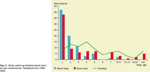 Totaldelay til diagnosticering var gennemsnitligt 42 dage (median: 27 dage). For 23 patienter med IgM-indeks > IgG-indeks fra spinalvæsken var totaldelay gennemsnitligt 33 dage (median: 24 dage), og for 49 patienter med IgM > IgG fra serumprøverne var gennemsnitligt delay 24 dage (median: 21 dage). Forsinkelsen i diagnostik var forklaret med både forsinket henvendelse fra patienten (patient delay ) med symptomer samt varierende tid fra lægens første undersøgelse til endelig bekræftet diagnose (doctor delay ) (Figur 3 ). Ni patienter (11%) diagnosticeret med neuroborreliose havde negative serumprøver for antistof imod Borrelia burgdorferi , samtidig med at indeksværdierne fra spinalvæsken var positive. Denne gruppe patienter havde et gennemsnitligt delay på 21 dage (median: 15 dage).