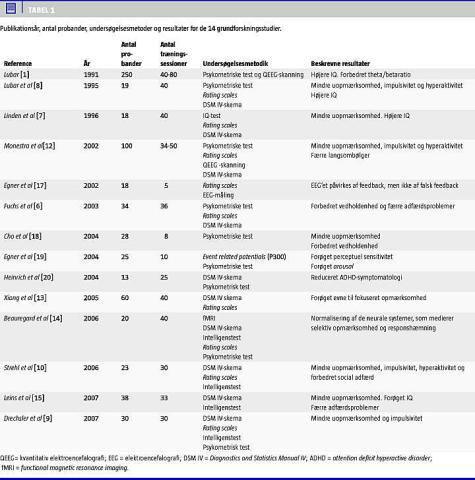 Ifølge søgemaskinerne PubMed og PsychInfo er der i alt publiceret 104 artikler om neurofeedback. I forbindelse med denne artikel har søgeordet i første omgang været »neurofeedback«. PubMed gav 102 søgeresultater, mens PsychInfo gav to. Disse 104 artikler omhandler hele det voksende felt, som neurofeedback udgør i forhold til en række lidelser, som f.eks. obsessiv-kompulsiv tilstand (OCD), epilepsi, tinnitus. Blandt de 104 artikler omhandler 24 artikler børn og unge med ADHD. De 24 artikler fordeler sig som følger: 14 omhandler grundforskning, syv er reviews vedrørende forskellige træningsmetoder og en række af de tidlige forskningsmæssige fund fra feltets pionerer, og tre omhandler relaterede emner. Et enkelt af de 14 grundforskningsstudier indeholder samtidig et review over feltets hidtidige resultater [1]. I det følgende refereres overvejende til grundforskningen. Ud over disse 24 artikler findes en række bøger på området.