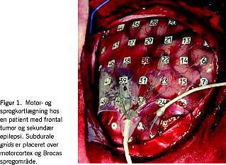 Monitorering med intrakraniale elektroder, enten som et netværk af elektroder (grid ) (Figur 1 ) til registrering af EEG direkte fra hjernens cortex (kortikografi) eller som dybdeelektroder, giver mulighed for præcis lokalisering af et epileptisk focus. Intrakraniale elektroder har i en årrække været anvendt peroperativt ved epilepsi- og hjernetumoroperationer, og inden for de seneste år har man kunnet foretage døgnmonitorering med intrakranialt EEG. Man kan desuden stimulere elektroderne i det indopererede grid og dermed foretage en funktionel kortlægning af cortex, hvilket udføres ved et tæt samarbejde mellem kliniske neurofysiologer, neuropsykologer og neurokirurger. Herved lokaliseres områder med vigtige funktioner såsom sprogområder og motoriske områder, og det operative indgreb kan planlægges, så mest muligt patologisk væv fjernes, og vigtigt væv bevares.