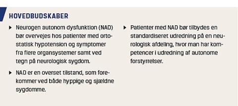 I udredning og behandling af patienter med NAD kan der indgå medicinsk, hæmatologisk, patologisk, neurokirurgisk, kardiologisk, neurofysiologisk, neurologisk, urologisk og gastroenterologisk ekspertise. Mange patienter har symptomer fra flere organsystemer, og det kan tage tid at stille diagnosen. Dog bør man altid overveje den hos en patient med OH og symptomer fra flere organsystemer [12] og ved samtidig neurologisk sygdom. Patienter med NAD bør tilbydes en standardiseret udredning på en neurologisk afdeling, hvor man har kompetencer i udredning af autonome forstyrrelser. Det er vigtigt, at en afdeling er tovholder, indtil ætiologien for den autonome dysfunktion er klarlagt. Den optimale behandling af patienter med svær NAD kræver et multidisciplinært team.