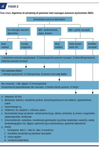 Udredning af patienter med NAD kræver viden om de tilgrundliggende årsager (Figur 2). Der udføres således en fuld neurologisk undersøgelse med fokus på den kognitive funktion, ekstrapyramidale symptomer samt stor- og småfiberdysfunktion. Det vurderes, om der udelukkende er tegn på NAD uden neurologiske udfald, og om tilstanden er akut/subakut som ved autoimmun- eller paraneoplastisk autonom ganglionopati eller kronisk og progredierende som ved PAF. Der kan være tale om NAD med samtidige ekstrapyramidale symptomer, demens, apopleksi eller perifer neuropati.