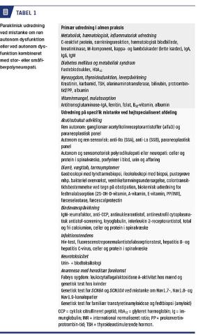 Patienter med NAD og neuropati bør gennemgå en bred biokemisk screening for mulige årsager til deres polyneuropati (Tabel 1), herunder skal der hos udvalgte patienter med overvægt og disposition for diabetes udføres en metabolisk udredning for diabetes og metabolisk syndrom. Behandlingsinduceret polyneuropati ved diabetes bør overvejes [15]. Biokemisk udelukkes uræmi, hypotyroidisme, leverpåvirkning og B12-