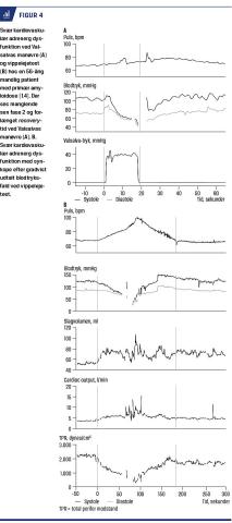 Tilstanden karakteriseres yderligere ved en udvidet autonom udredning, som kan omfatte måling af det kardiovagale respons ved dyb respiration (Figur 3), Valsalvas manøvre og vurdering af den kardiovaskulære adrenerge funktion ved måling af ændringer i blodtrykket ved Valsalvas manøvre og vippelejetest (Figur 4). Ved aflejringssygdomme eller anden kardial involvering bør der foretages en kardiologisk udredning før den autonome test, da kardiomyopati, vaskulopati og hjerteinsufficiens kan påvirke det kardiovaskulære adrenerge respons.
