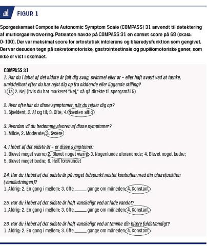En 56-årig mand blev indlagt med subakut udvikling af sympatisk dysfunktion med ortostatisk hypotension og synkoper. Han havde tegn på parasympatisk dysfunktion med lysintolerans, problemer med at fokusere, tørhed i munden, urinretention og erektil dysfunktion. Mave-tarm-kanalens nervesystem var påvirket, og han havde vekslende diarré og obstipation, mavesmerter samt hurtig mæthedsfornemmelse. Han havde haft et vægttab på 30 kg over ca. seks måneder. Composite Autonomic Symptom Scale 31 [2] blev anvendt til at screene for NAD (Figur 1).