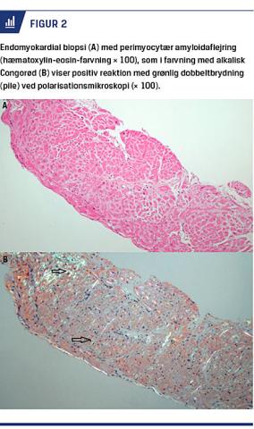 En endomyokardial biopsi viste kardial amyloidose ved bl.a. alkalisk Congorødfarvning (Figur 2). Immunfarvningen tydede på amyloidaflejring med lambdamonoklonalitet. Pga. presserende behandlingsbehov blev der ikke foretaget massespektroskopi, som kunne have sikret undertypen af amyloid hos patienten, som havde plasmacelledyskrasi.