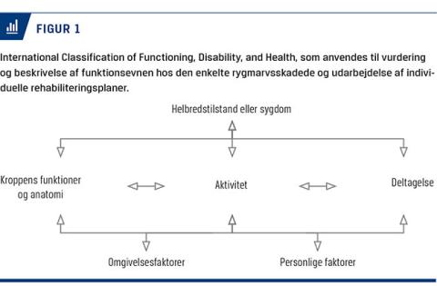 Rehabilitering af rygmarvsskade tager afsæt i den internationale klassifikation af funktionsevne International Classification of Functioning, Disability, and Health (Figur 1), som anvendes dels til vurdering og beskrivelse af funktionsevnen hos den enkelte rygmarvsskadede, og dels til udarbejdelse af individuelle rehabiliteringsplaner med henblik på at maksimere funktionsniveauet. Ændringer i kroppens normale funktion og anatomi som følge af rygmarvsskade vil i større eller mindre omfang medføre begrænsninger i de ramtes aktiviteter. Medicinsk behandling, fysisk genoptræning, personlige faktorer og tilpasning af omgivelserne kan i et vist omfang kompensere for skaden.