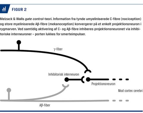 Anvendelse af elektrisk strøm til behandling af kroniske smerter accelererede i 1960’erne, efter at Melzack & Wall offentliggjorde deres teori om smertemodulation i rygmarven (Figur 2) [15]. Smerteteorien kom til at danne grundlaget for elektrisk stimulation af rygmarvens bagstrenge og senere dorsalrodsganglier samt transkutan elektrisk nervestimulation, der siden er veletablerede og veldokumenterede metoder til lindring af ellers behandlingsrefraktære kroniske smerter [16, 17].