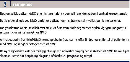 Neuromyelitis optica (NMO) er en inflammatorisk demyeliniserende sygdom (IDS) i centralnervesystemet (CNS), og den er næst efter multipel sklerose (MS) formentlig den hyppigst forekommende IDS i CNS [1]. NMO er en sygdom med autoimmune karakteristika og kan forekomme sammen med andre autoimmune sygdomme enten sekventielt eller samtidigt [2-4].